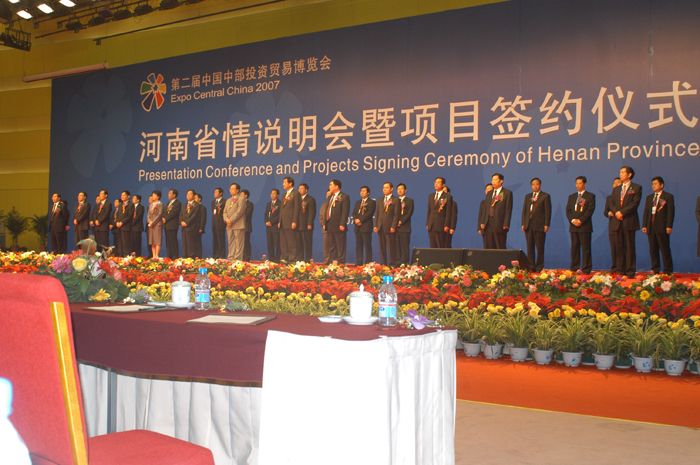 第二届中国中部投资贸易博览会于2007年4月26日在郑州国际会展中心正式开幕,为期三天。本届中博会由商务部、税务总局、工商总局、广电总局、旅游局、中国贸促会、全国工商联、中国工业经济联合会及山西、安徽、江西、河南、湖北、湖南六省人民政府联合主办,主题是“促进中部崛起,构建和谐社会”。